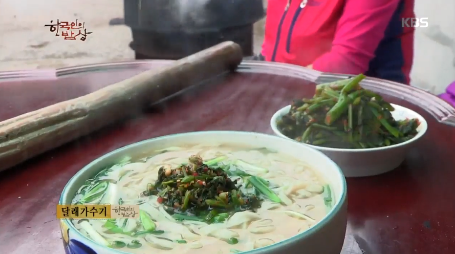 ‘달래가수기’는 밀가루에 콩가루를 섞어 반죽을 한 뒤에 밀어서 얇게 썰어줍니다. 끓는 물에 막장을 풀어 끓이다가 칼국수면을 풀어 끓입니다. 그리고 건진 뒤에 달래를 썰어 넣고 갓김치를 올려줍니다.