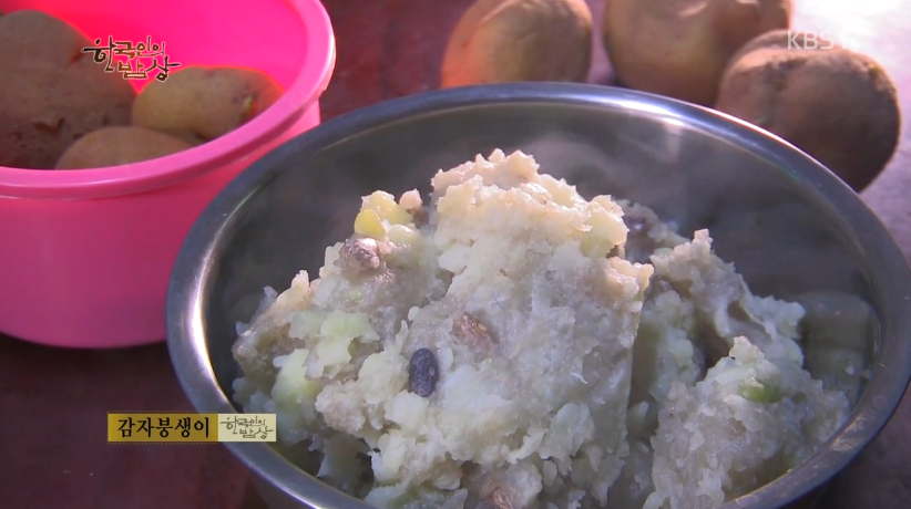 ‘감자붕생이’는 감자를 깍은 뒤에 강판에 갈아 면보에 한 번 짜서 건더기에 강낭콩을 넣어 잘 섞어 한주먹씩 쥐어서 감자를 밑에 깔고 그 위에 올려서 같이 찐 다음에 꺼내서 절구로 찧어서 잘섞어줍니다. 그리고 수저로 떠서 먹습니다.