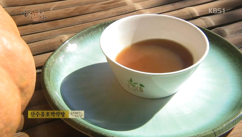 ‘산수유호박약탕’은 잘 익은 늙은 호박 뚜껑을 따고 속을 손으로 긁어 낸 다음 도라지, 대추, 은행, 밤, 배, 산수유 말린 것을 넣고 뚜껑을 닫은 뒤에 호박 전체에 밀가루 풀을 바르고 한지로 몇 겹 싸줍니다. 그리고 쌀겨로 불구덩이를 만들어 불을 지펴서 호박단지를 넣고 위에 스텐볼을 덮고 그 위에 쌀겨를 덮어 2일 정도 은근히 익힙니다. 그리고 즙을 걸러 먹습니다.
