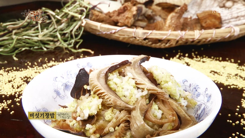 ‘버섯기장밥’은 기장을 씻어서 쌀과 함께 냄비에 넣고 밥을 짓고 뜸들이기 전에 삶은 버섯을 찢어 위에 얻어 뜸을 들입니다.