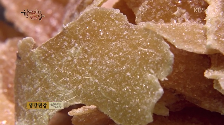 '생강편강'은 생강을 편으로 얇게 썰어 끓는 물에 데칩니다. 넓은 팬에 데친 생강을 넣고 설탕을 뿌리면서 잘 볶아줍니다. 그리고 체반에 올려 잘 말립니다.