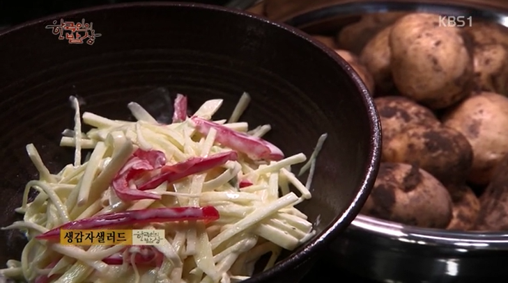 '생감자샐러드'는 감자를 잘 문질러서 흙을 잘 씻어 껍질을 까서 채를 썰어줍니다. 오이채, 파프리카채와 함께 소스를 뿌려줍니다.