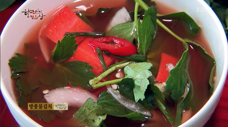 '방풍물김치'는 맑게 고춧가루 물을 만들고 소금으로 간을 하고 연한 방풍잎, 쪽파, 당근, 양파 등을 넣어줍니다.