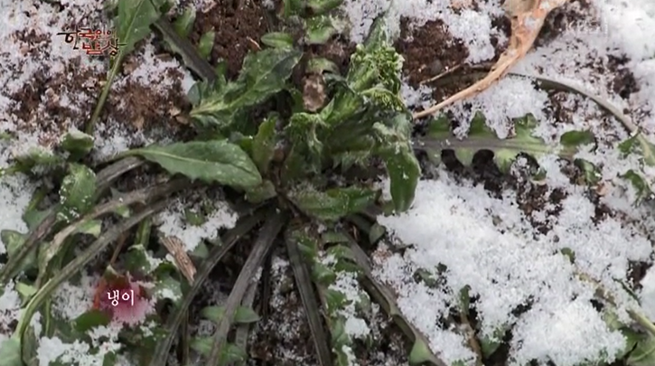 겨울 냉이는 추위를 견디기 위해 땅에 바싹 붙어 옆으로 자라납니다.