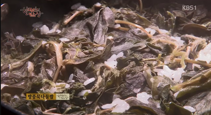 '방풍묵나물밥'은 말린 방풍을 물에 불린 뒤에 불린 쌀위 에 올려서 함께 밥을 합니다. 그리고 달래간장을 넣고 비벼줍니다.