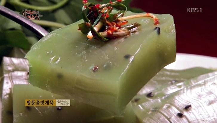'방풍올방개묵'은 방풍나물을 썰어 믹서기에 물과 함께 갈아줍니다. 올방개뿌리전분과 방풍물을 함께 잘 섞어 약한 불에 끓이다가 묵처럼 되면 흑임자와 소금을 조금 넣고 잘 섞어줍니다. 그리고 틀에 넣고 식혀 먹기 좋게 썰어줍니다.