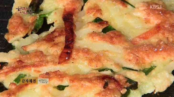 '감자채전'은 감자채, 부추, 당근채에 찹쌀가루를 잘 섞어줍니다. 그리고 기름을 넉넉히 두르고 튀기듯 구워줍니다.