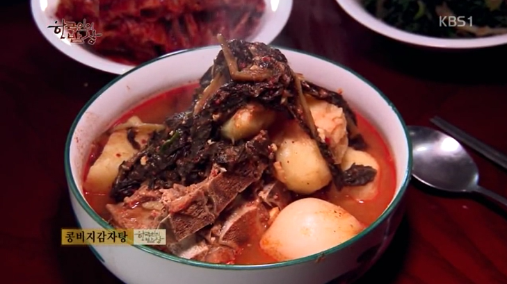 '콩비지감자탕'은 돼지 등뼈를 솥에 넣고 된장을 풀어 끓입니다. 거기에 감자를 큼직막하게 넣고 잘 불린 시래기를 넣은 뒤 콩비지와 고춧가루를 넣고 푹 끓입니다.