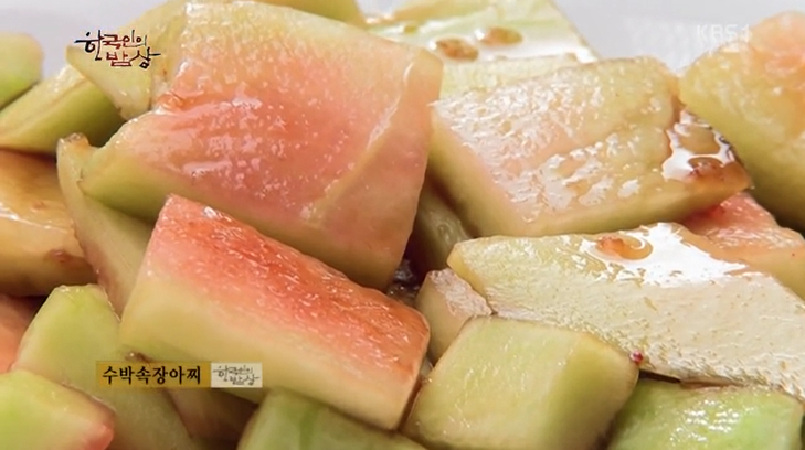 '수박속장아찌'는 수박속을 나박하게 썰어 항아리에 넣고 간장, 식초, 설탕 끓인 물을 부어 일주일 정도 숙성합니다.