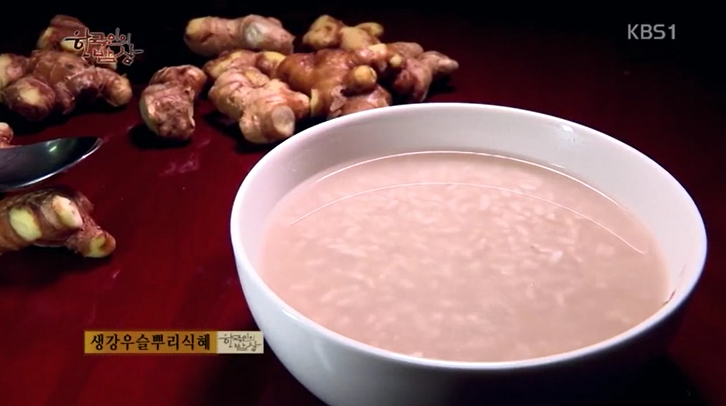 '생강우슬뿌리식혜'는 생강은 씻어 껍질을 벗기고 우슬도 잘 씻어서 솥에 넣고 물을 붓고 3~4시간 정도 푹 끓입니다. 그리고 엿기름에 그 물만 넣고 잘 섞어 줍니다. 고들밥을 지은 밥솥에 채에 끓인 물만 넣고 보온 상태로 반나절 정도 삭힙니다. 그리고 한 번 더 끓입니다.