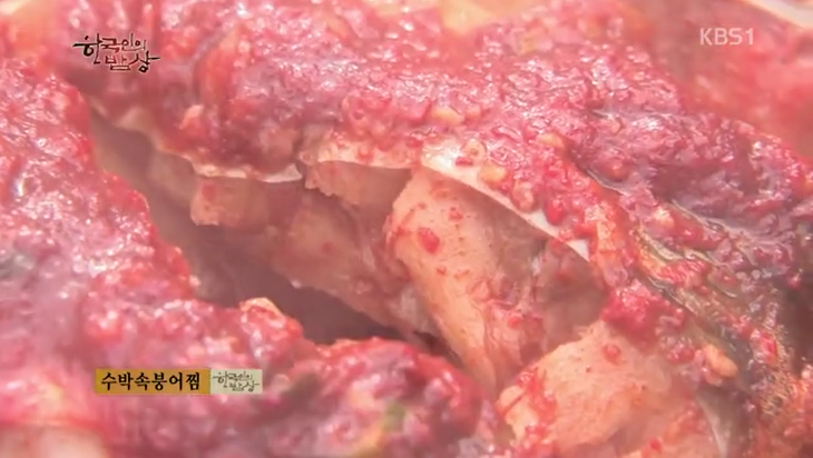 '수박속붕어찜'은 수박의 껍질에 겉껍질을 벗기고 냄비에 깔고 손질해서 칼집을 낸 붕어를 올립니다. 그리고 수박고추장, 고춧가루, 다진마늘, 다진 생강, 간장 등을 넣고 소스를 만들어 위에 발라 물을 자작하게 넣고 조립니다.
