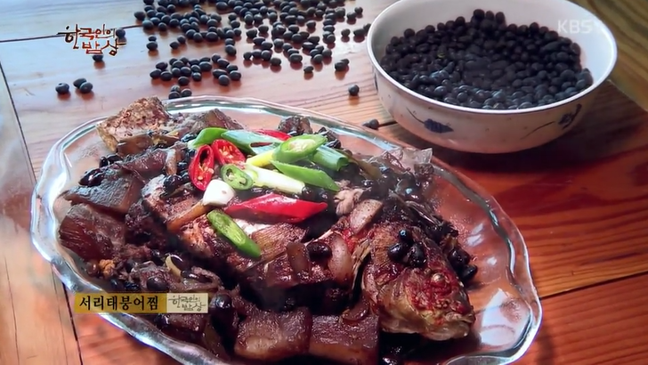 ‘서리태붕어찜’은 참붕어를 껍질을 벗겨 손질을 해서 배갈라 내장도 빼고 씻은 후 맛술을 뿌려 비린내를 제거합니다. 냄비에 무와 불린 서리태를 깔고 붕어 배에 서리태 콩과 붕어 알을 넣고 올린 뒤에 대파, 고추 등 야채를 올리고 고추장소스를 올려서 물을 자작하게 붓고 조려줍니다.