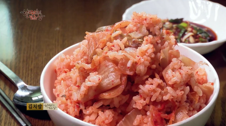 ‘김치밥’은 솥에 물을 자작하게 붓고 김치를 송송 썰어 넣고 참기를을 둘러준 뒤 불린 쌀을 올려서 밥을 짓습니다. 양념간장과 참기름을 넣어 비벼먹습니다.