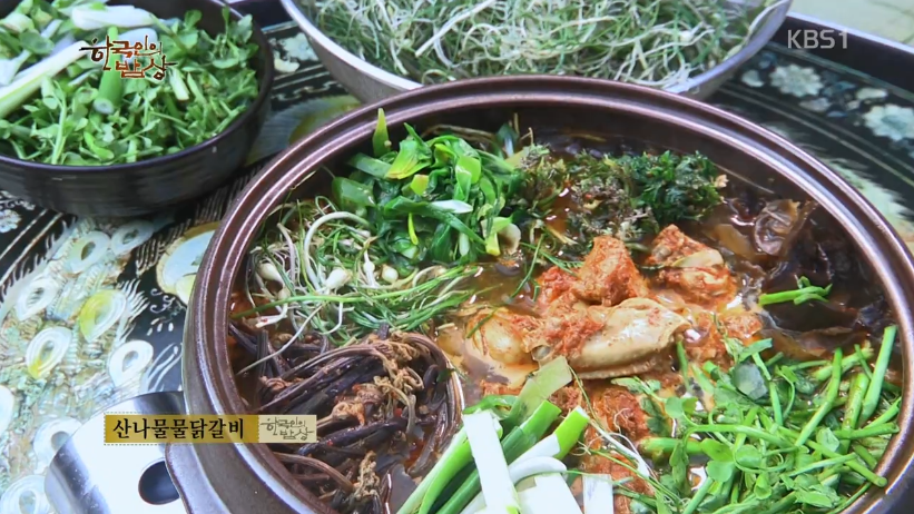 ‘산나물물닭갈비’는 토종닭을 토막을 내서 고춧가루, 소금 등을 넣고 무쳐줍니다. 냄비에 닭을 넣고 데친 냉이, 데친 원추리, 달래, 고사리 등을 올린 뒤에 물을 붓고 끓입니다.