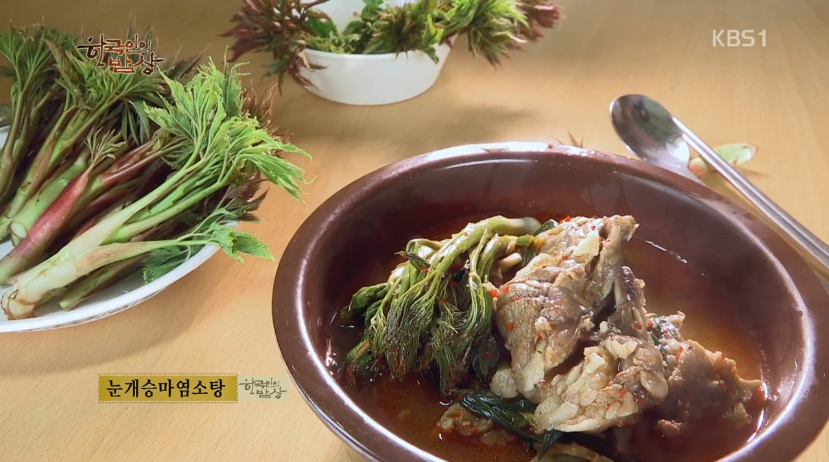 ‘눈개승마염소탕’은 솥에 물을 붓고 염소갈비, 엄나무순, 양파, 파, 무 등을 넣고 푹 삶아줍니다. 먹기 좋게 갈비를 썰어서 눈개승마, 부추, 파, 양파, 깻잎, 고춧가루, 다진마늘 등을 넣고 무쳐서 걸른 육수에 넣고 끓입니다.