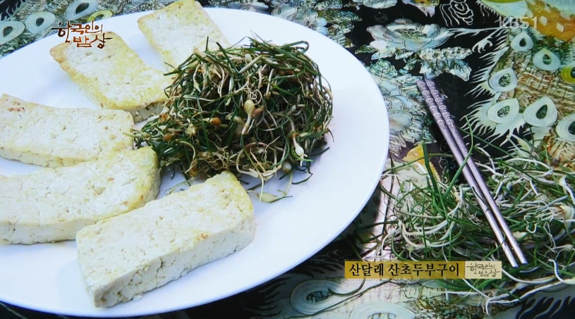 ‘산달래산초두부구이’는 팬에 산초기름을 두르고 손두부를 큼직막하게 썰어 부쳐줍니다. 달래를 잘 씻어 손질을 해서 송송 썰어 간장, 설탕, 식초 등을 넣어 잘 무쳐줍니다. 두부 위에 달래간장 올려서 먹습니다.