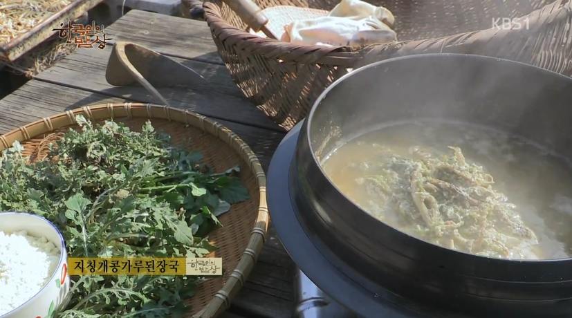 ‘지칭개콩가루된장국’은 지칭개를 물에서 흙을 잘 씻은 뒤에 빨래빨듯이 계속 치대서 씻어서(쓴 맛을 빼기위해) 물에 담가두었다가 물기를 꽉 짜줍니다. 된장 푼 물이 끓으면 콩가루를 잔뜩 묻힌 지칭개를 넣고 끓입니다.