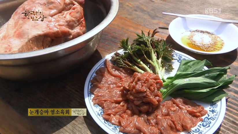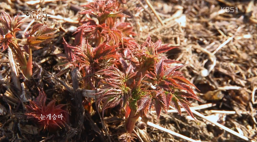 해발 500m 고지 먹성 좋은 염소들이 풀을 다 먹고 나면 산나물밭에 산나물이 올라온다고 합니다. 눈 속에서 올라와서 얼음나물이라고 불리는 눈개승마는 인삼, 두릅, 고기 세가지 맛이 나는 삼나물로 더 많이 알려져 있습니다. 한 뼘 정도 되는거나 약간 작은게 더 맛있다고 합니다.