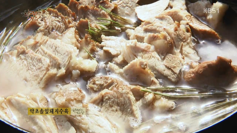 ‘약초솔잎돼지수육’은 황기, 둥굴레, 헛개나무, 오가피 등을 넣고 끓이다가 건더기는 다 건져내고 돼지고기 덩어리를 넣고 삶아줍니다. 냄비에 솔잎을 올리고 수육을 먹기 좋게 썰어 올린 뒤에 육수를 부어 약한 불에 올려놓고 먹습니다.