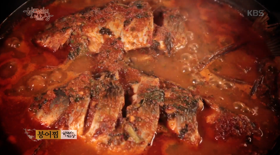 ‘붕어찜’은 붕어의 지느러미와 것에 비늘을 벗기고 내장을 발라낸 다음 칼집을 내줍니다. 아카시아, 와송, 포도, 냉이, 두릅, 쇠비름 효소에 바나나, 사과, 말린 인삼을 넣고 갈아준 다음 미나리송송에 된장, 고추장, 들깨가루, 들기름을 잘 비벼 줍니다. 냄비에 고사리를 깔고 양념을 바르고 붕어 뱃 속까지 양념을 잘 발라 육수를 자작하게 붓고 조려줍니다.