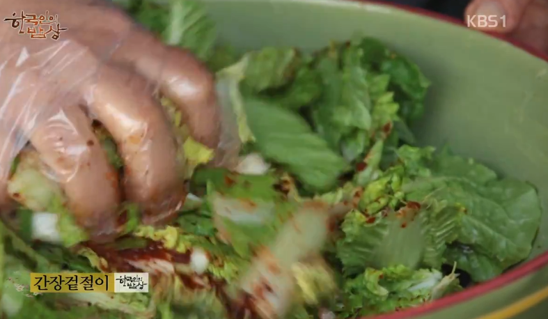 ‘간장겉절이’는 봄동을 잘 씻어 먹기 좋게 손으로 뜯고 간장으로 간을 해서 잘 섞어 줍니다. 그리고 쪽파, 다진마늘, 고운 고춧가루, 매실청 등을 넣고 잘 묻혀줍니다.