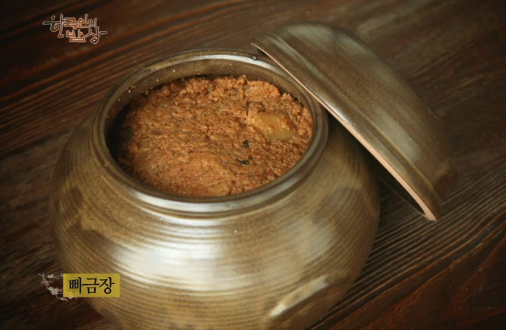 ‘빠금장’은 한 달 정도 띄운 메주를 잘게 찧어서 물을 부어 하루 정도 불려줍니다. 그리고 소금으로 간을 하고 고춧가루, 김치국물을 섞어 항아리에 넣고 한 달 뒤에 먹을 수 있습니다.