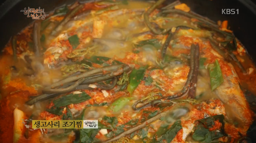 ‘생고사리조기찜’은 냄비에 참기름을 두르고 고사리를 볶아 줍니다. 그리고 그 위에 잘 다듬은 조기를 가득 올려 주고 김치국물을 올려서 조립니다.
