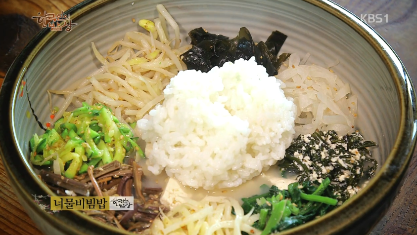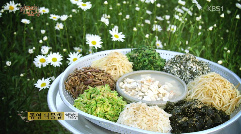 ‘통영식너물밥’은 고사리는 다진 마늘, 어간장을 넣고 볶아줍니다. 데친 톳과 두부에 어간장을 넣고 으깨면서 무쳐줍니다. 조개, 새우 살을 다져서 참기름을 두르고 볶다가 쌀뜨물을 넣고 끓으면 두부를 썰어 넣고 어간장으로 간을 해줍니다. 미역은 어간장, 참기름, 깨소금으로 무쳐줍니다. 이런식으로 해초와 나물을 10여가지 무쳐줍니다. 그리고 그릇에 밥을 넣고 나물을 넣은 뒤에 두부탕을 넣어 비벼먹습니다.