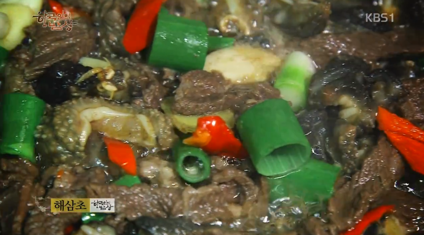 ‘해삼초’는 어간장과 물을 살짝 섞어 자작하게 끓이다가 나박하게 썬 소고기를 넣고 볶아 줍니다. 그리고 해삼의 입과 내장을 골라내고 썰어서 고기가 익을 때 넣고 파, 생강, 고추 등을 송송 썰어 넣고 볶아냅니다.