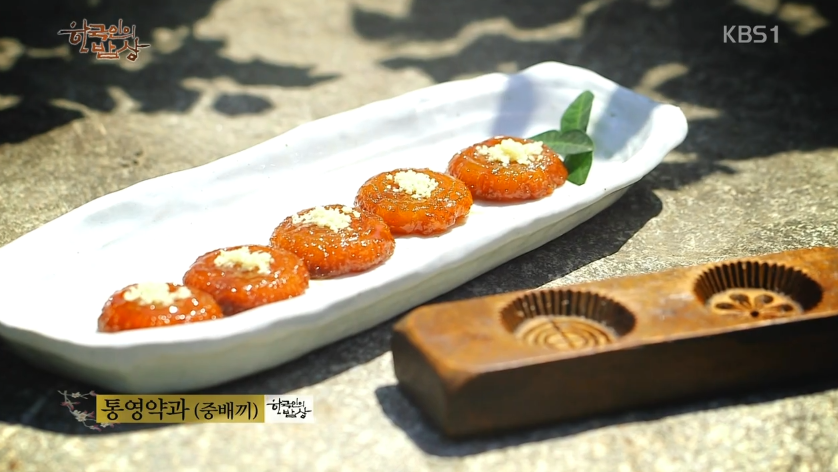 ‘통영 약과’는 팬에서 쌀을 약한 불에서 노랗게 될 때까지 볶아서 믹서기에 갈아 체에 내려줍니다. 물에 꿀과 생강즙을 타서 가루에 넣고 반죽을 한 뒤에 약과틀에 눌러 냅니다. 그리고 기름에 튀겨줍니다. 다시 조청에 담가 꺼낸 뒤에 잣가루를 올려줍니다.