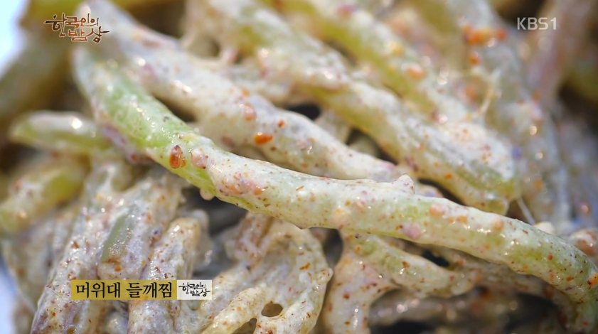 ‘머위대 들깨찜’은 솥에 참기름 간장을 두르고 머위대를 볶다가 들깨가루를 듬뿍 넣고 볶아냅니다. 마지막에 통깨를 넣어 섞어줍니다.