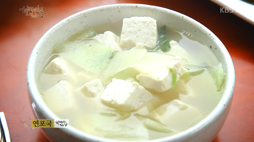 ‘연포국’은 끓는 물에 무를 얇게 썰어 넣고 두부 송송, 쪽파를 넣고 간장으로 간을 합니다.