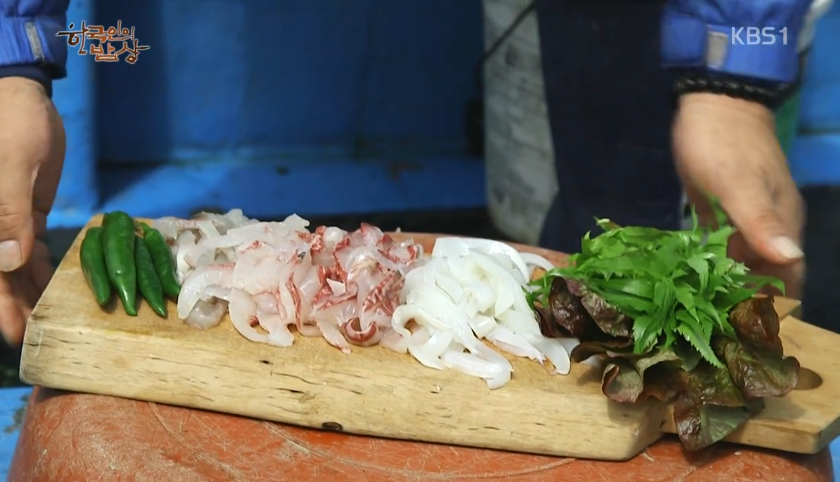 ‘어부밥상’은 숭어를 얇게 회를 떠고 갑오징어도 껍질을 벗기고 얇게 썰어줍니다. 주먹밥에 회를 초장을 찍어 올려 김치와 함께 먹습니다.