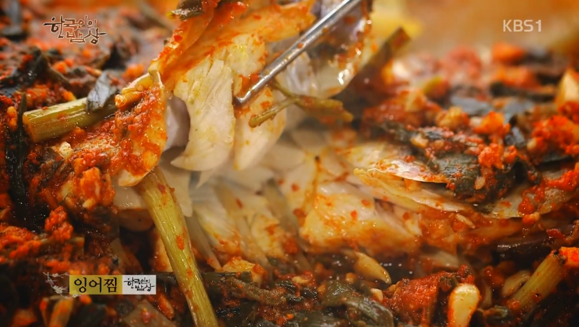 ‘잉어찜’은 고사리를 간장, 청을 넣고 잘 무쳐서 손질한 잉어의 배에 채운 뒤에 솥에 무를 깔고 올립니다. 간장, 고춧가루, 파송송, 방아잎 송송, 제피가루, 다진마늘 등으로 양념장을 만들어서 잉어뱃속에 넣고 물을 자작하게 붓고 끓입니다.