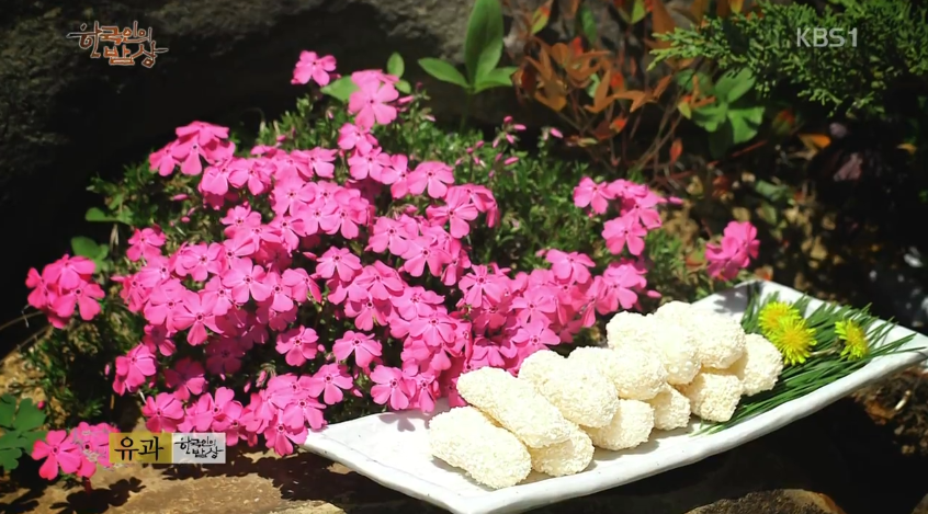 ‘유과’는 찹쌀떡을 뻐금 소리가 날 때까지 계속 칩니다. 찹쌀가루 깔고 떡을 밀어서 자른 뒤에 손가락 한 마디 정도로 잘라서 살살 밀어 모양을 만들어 채반에 널어 햇빛에 말립니다. 그리고 낮은 온도 기름에 말린 떡을 넣고 좀 불어 나면 170도 이상 기름에 넣고 더 부풀면 건져 냅니다. 조청과 꿀을 끓여서 유과속을 넣어 옷을 입힌 뒤에 튀밥에 넣어 잘 눌러 붙여줍니다.
