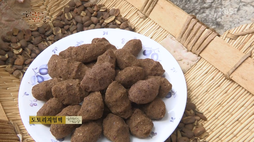 ‘도토리지엄떡’은 도토리 껍질을 까서 말린 도토리를 도토리쌀이라고 합니다. 도토리쌀을 끓여서 버리고를 여러 번 해서 떪은 맛을 제거하고 절구에 넣고 빻아 체에 걸러 곱게 내립니다. 팥도 삶아서 손으로 비비면서 곱게 체에 내려줍니다. 도토리가루와 팥가루를 잘 섞은 뒤에 꼭꼭 쥐었다 폈다 하며서 눌러모양을 잡아줍니다.