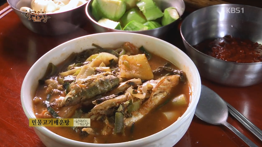 ‘민물고기 매운탕’은 솥에 고추장을 풀고 삶은 시래기와 된장을 잘 주물주물해서 넣고 나박한 무를 넣고 끓입니다. 그리고 잘 씻은 물고기에 밀가루를 잘 묻혀준 다음에 넣고 칡반죽으로 수제비를 떠서 넣어 끓입니다. 마지막에 미나리, 깻잎, 파를 잔뜩 넣고 끓여냅니다.