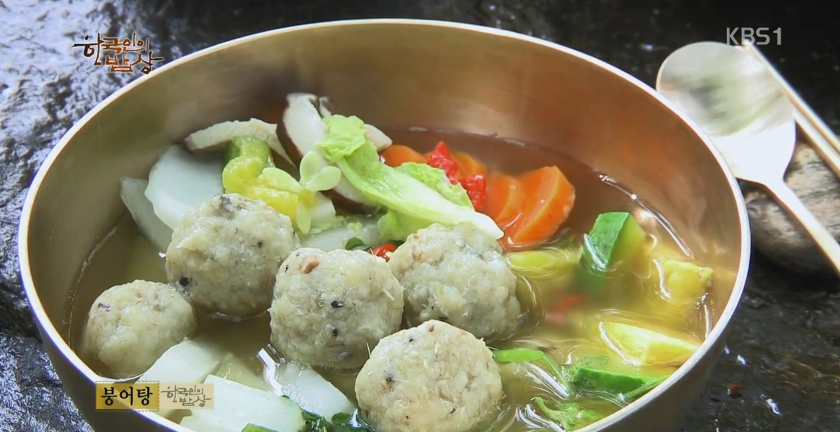 ‘붕어탕’은 붕어의 배를 갈라 내장을 손질해서 청주를 넣고 이틀 정도 둔 다음 찜통에 넣고 쪄줍니다. 살만 바른 뒤에 버섯 등과 함께 잘 치대서 둥글게 반죽을 합니다. 황태로 낸 육수에 야채를 넣고 붕어살덩어리를 넣고 끓여냅니다.