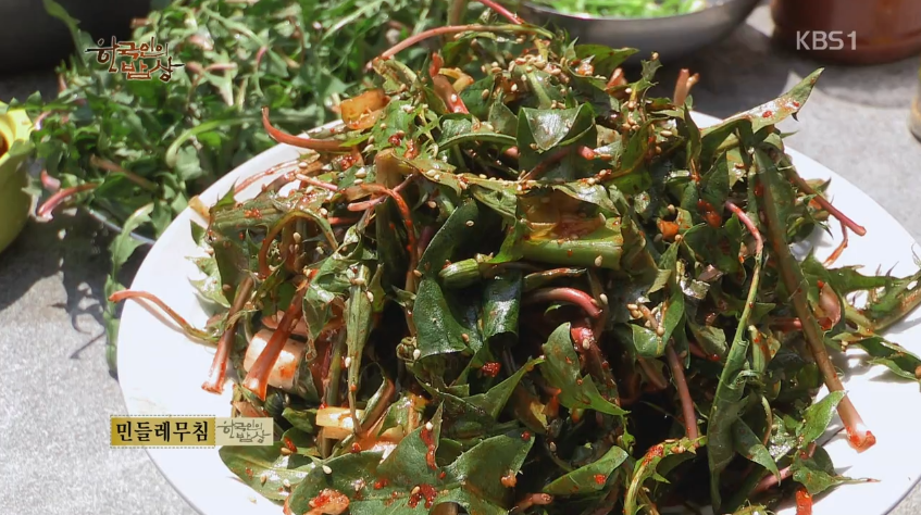 ‘민들레무침’은 민들레잎에 다진마늘, 다진파, 고춧가루에 초고추장 등을 넣고 무쳐줍니다.