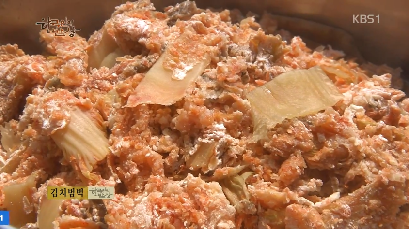 ‘김치범벅’은 묵은지를 썰어 밀가루에 버무려서 시루에 넣고 쪄줍니다.