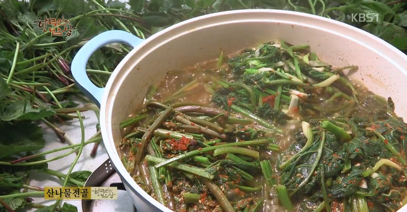 ‘산나물민물고기조림’은 냄비에 시래기, 된장, 고추장, 다진마늘, 들기름을 넣고 잘 버무려 깔고 참나물, 미나리를 깔아줍니다. 그리고 민물고기를 손질한 뒤에 칼집을 내서 올려줍니다. 깨소금, 시래기 비볐던 양념을 올리고 파를 올리고 조려줍니다.