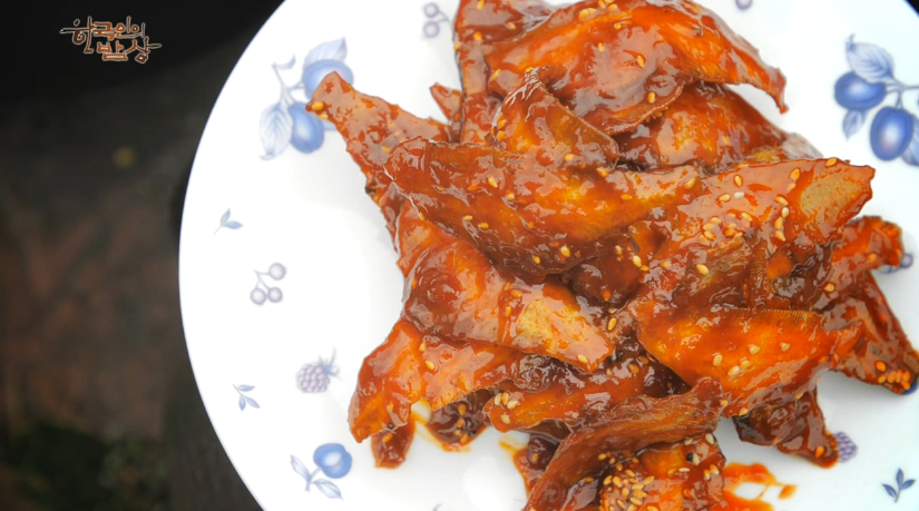 ‘가자미무침’은 말린 가자미를 노른하게 튀겨줍니다. 고추장, 간장, 다진마늘, 물엿 등으로 잘 섞어 소스를 만들어 튀긴가자미를 넣고 잘 비벼줍니다.