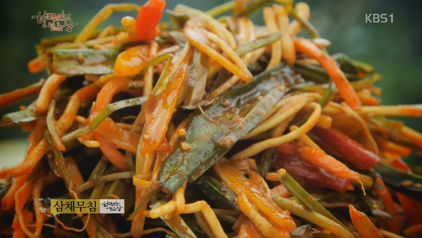 ‘삼채무침’은 삼채를 뿌리째 잘 씻어서 7cm정도로 잘라서 당근채, 파프리카채 등과 함께 고추장양념에 무쳐줍니다.