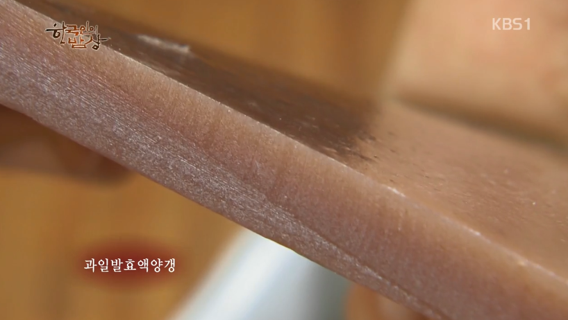 ‘과일발효액양갱’은 한천 물에 과일식초와 팥앙금을 넣고 끓이고 틀에 넣어 굳힙니다.