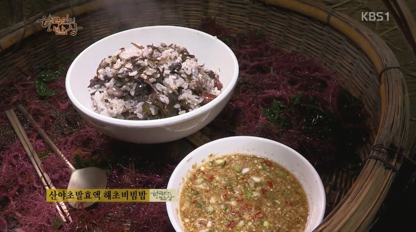 ‘산야초발효액해초비빔밥’은 간장, 다진마늘, 다진파, 다진고추, 깨소금, 산야초발효액 등을 넣고 양념을 만든 뒤에 해초밥 위에 얻어 비벼먹습니다.