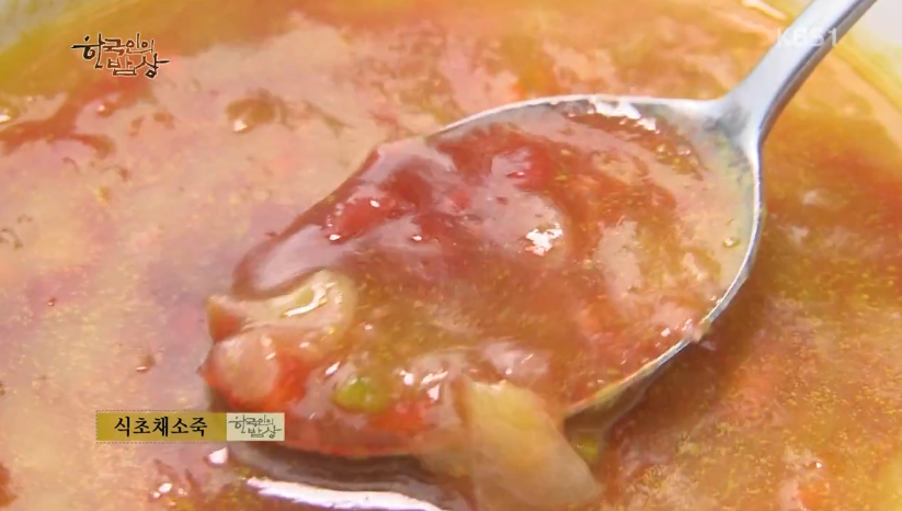 ‘식초채소죽’은 끓는 물에 양배추를 다진 것, 단호박 다진 것, 당근다진 것을 넣고 저으면서 푹 끓입니다. 그리고 그릇에 담은 뒤에 식초와 간장을 넣어 간을 해서 먹습니다.