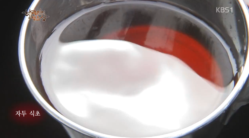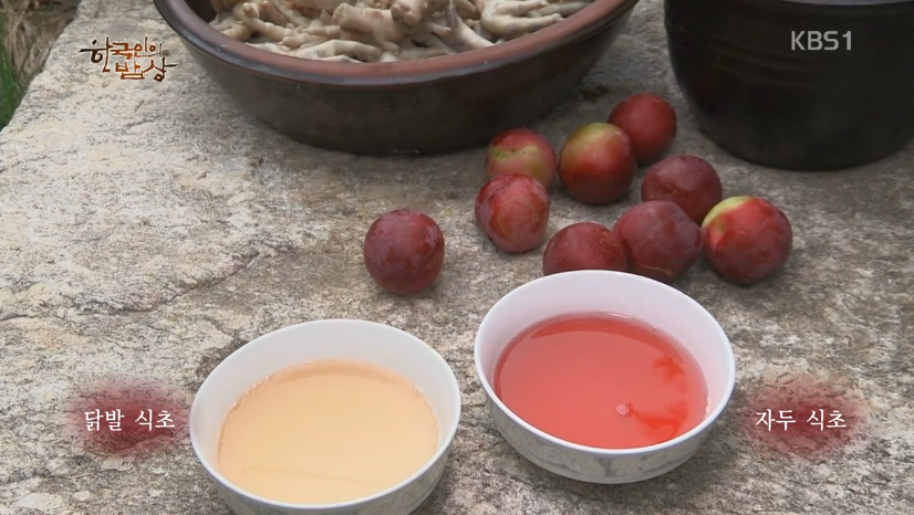‘자두식초’는 자두를 씻어 씨(독성있음)를 발라내고 과육만 햇빛에 3일 넘게 말립니다. 보리에 잡곡을 섞어 고두밥을 지어서 엿기름을 잘 섞은 뒤에 말린자두와 누룩에 물과 잘 섞어서 항아리에서 숙성을 시킵니다. 2~3개월 지나면 초막을 형성하는데 그러면 좋은 식초가 된다고 합니다. 천연발효 식초는 오래될수록 맛과 향기가 좋다고 합니다.