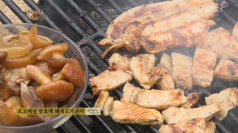 ‘표고버섯발효액돼지고기구이’는 돼지고기에 다래발효액을 넣고 후추를 뿌려서 재워둡니다. 그리고 돼지고기를 구우면서 표고버섯발효액을 살짝 발라 구워줍니다. 그리고 표고버섯으로 담근 발효액에서 표교버섯을 꺼내 먹기 좋게 썰어 고기와 함께 먹습니다.