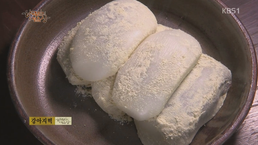 ‘강아지떡’은 찹쌀을 쪄서 떡메치기를 해서 콩가루에 묻혀 팥 소를 넣고 빚어 줍니다.