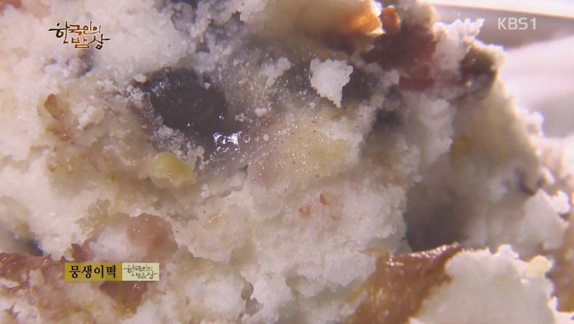 ‘뭉생이떡’은 찹쌀가루에 강낭콩 삶은 것, 호박고지 등을 넣고 잘 섞어 시루에 넣고 쪄줍니다.